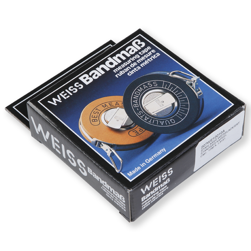 Das Stahlbandmass besteht aus verzinktem Stahlblech mit einem genarbtem PVC-Überzug und ist mit einem haltbarem, weissem Einbrennlack überzogen.