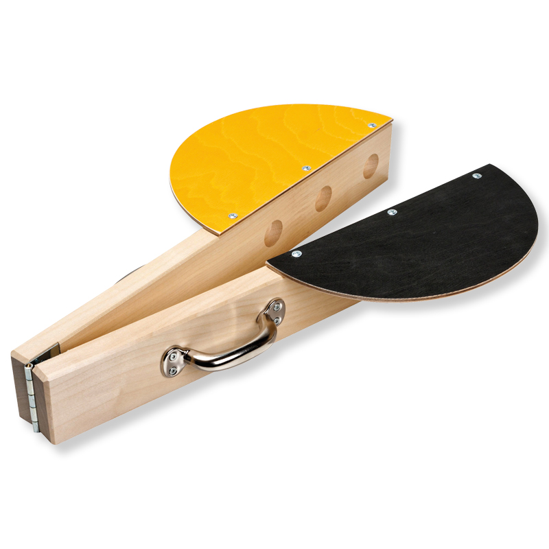 Die Klappe besteht aus mehrfach verleimter Multiplexplatte mit Griffen und Scharnier aus Metall. Die Anzeigefläche wird aus gelben und schwarzen, splitterfreiem Polystyrol gefertigt. Made in Germany.