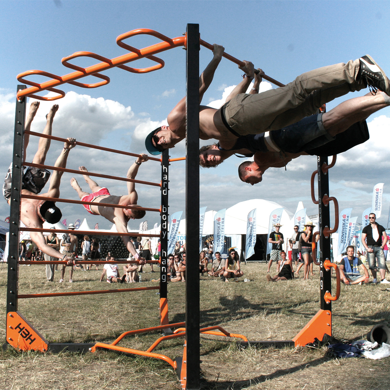 Die freistehende Calisthenics-Anlage ist ohne Fundamente oder Bodenbefestigung überall in kurzer Zeit auf- und wieder abbaubar. Die Stangen können je nach Anwender beliebig in der Höhe montiert werden.