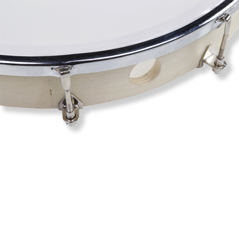 Der Korpus der Rahmentrommel besteht aus Holz und ist sehr gut verarbeitet. Das Tamburin ist mit einem Kunststofffell überzogen, welches spannbar ist. Es ist in verschiedenen Grössen erhältlich.