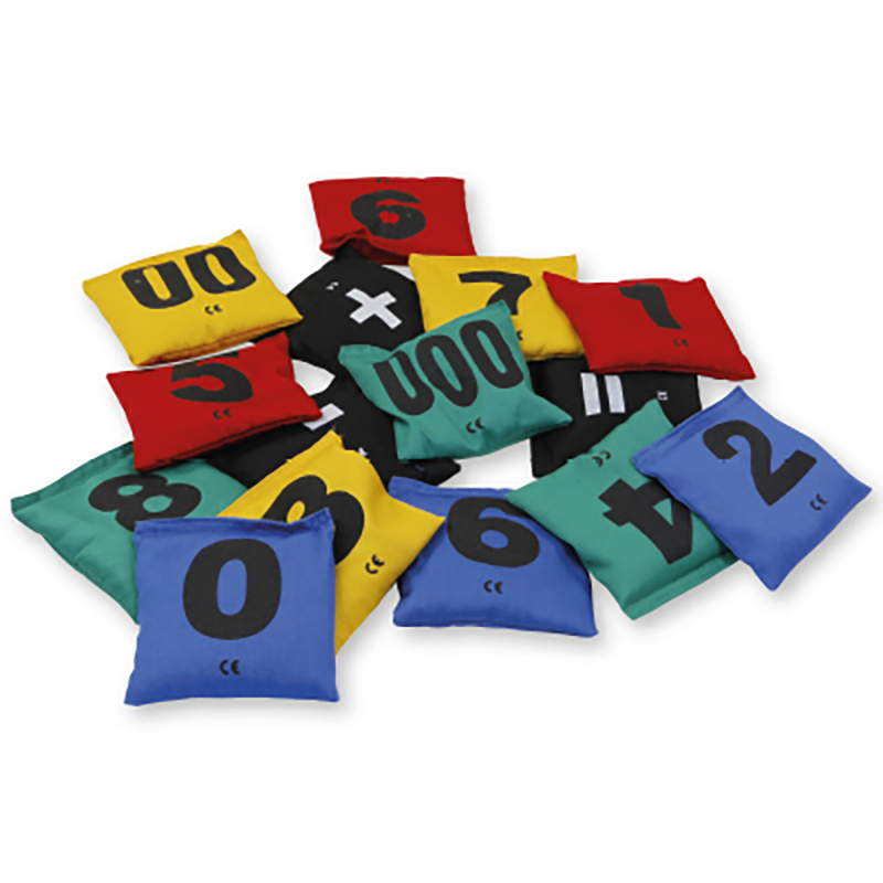 15 Bohnensäckchen mit unterschiedlichen Zahlen, ideal geeignet zum Balancieren, Werfen, Fangen, Greifen und Rechnen. Farbige Hülle aus strapazierfähigem Baumwollgewebe, Füllung aus hygienischem Granulat.