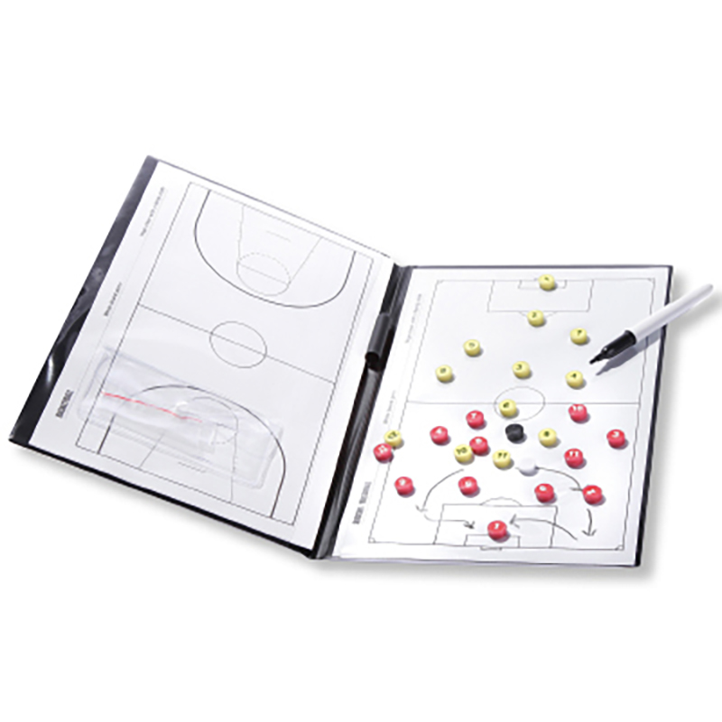 Handliches Taktik-Set für Trainer, Lehrer und Ausbilder. In der handlichen College-Mappe (ca. 32 x 22 cm) haben Sie ein magnethaftendes Spielfeld für zehn verschiedene Sportarten (Fussball, Handball, Basketball, Volleyball, Badminton, Eishockey, Rugby, American Football u. Tennis). Das Set enthält einen speziellen abwischbaren Schreiber, 12 rote und 12 gelbe Magnete mit Nummern, sowie 1 schwarzen und weissen Magneten für den Ball und Schiedsrichter. Die Lehrtafel ist die perfekte Ausstattung für Spielvorbereitung, -beobachtung und -analyse!