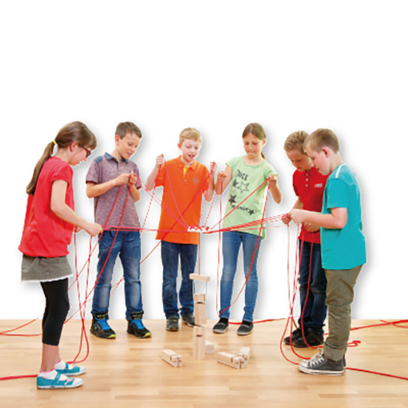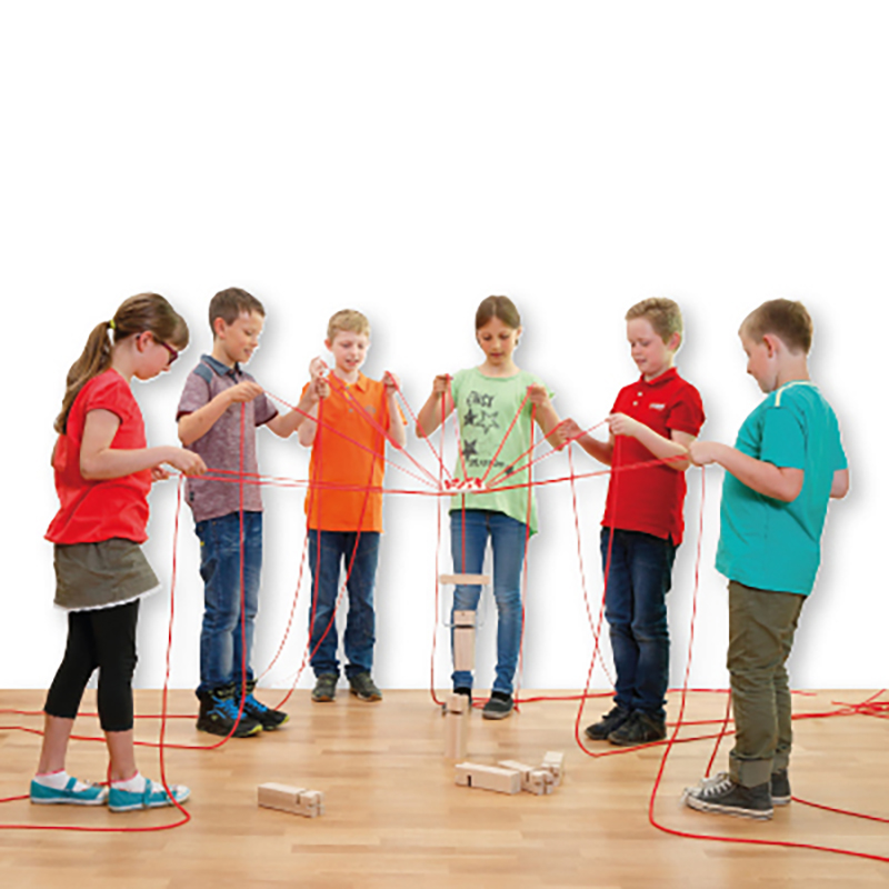 Das Team- und Koordinationsspiel ist schnell und einfach aufgebaut - ohne grosse Vorbereitung können die Spielelemente, 6 Klötze und 12 Seile, aus dem Stoffbeutel genommen und aufgebaut werden. Werden die Schnüre mit beiden Händen bewegt, dann ist das Teamspiel für maximal 12 Spieler geeignet. Bei der Steuerung und Bewegung mit einer Hand können bis zu 24 Spieler in der Gruppe agieren.