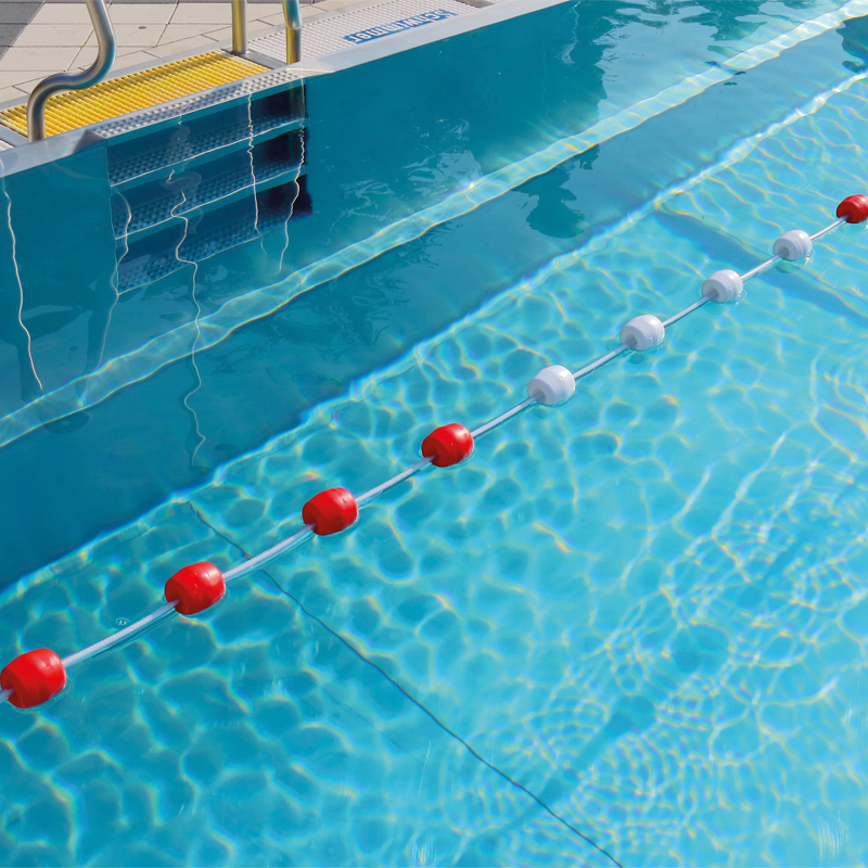 Schwimmleine mit Hostalen-Schwimmern und Abstandshaltern. Die Hostalen-Schwimmer (ca. 70 x 67 mm) liegen durch die Abstandshalter immer ca. 25 cm auseinander. Die Enden sind jeweils 5 m lang mit roten Schwimmern ausgestattet, im Mittelteil wechseln rot und weiss alle 100 cm. Die Leine besteht aus einem unverrottbaren, nicht dehnbaren und pflegefreien 6 mm Multilonseil und besitzt ausserdem rostfreie Karabinerhaken als Endbefestigung, eine Simplexklemme und eine Verstellacht. Trainingsleine gem. FINA-Vorschrift.