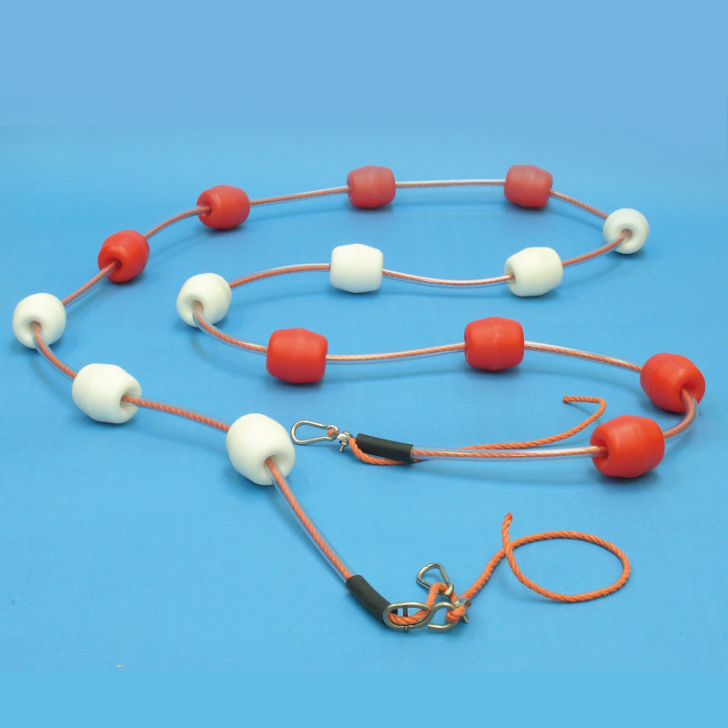 Schwimmleine mit Hostalen-Schwimmern und Abstandshaltern. Die Hostalen-Schwimmer (ca. 70 x 67 mm) liegen durch die Abstandshalter immer ca. 25 cm auseinander. Die Enden sind jeweils 5 m lang mit roten Schwimmern ausgestattet, im Mittelteil wechseln rot und weiss alle 100 cm. Die Leine besteht aus einem unverrottbaren, nicht dehnbaren und pflegefreien 6 mm Multilonseil und besitzt ausserdem rostfreie Karabinerhaken als Endbefestigung, eine Simplexklemme und eine Verstellacht. Trainingsleine gem. FINA-Vorschrift.