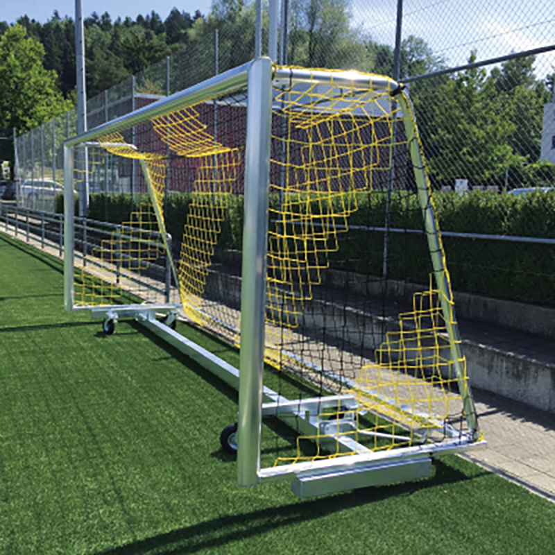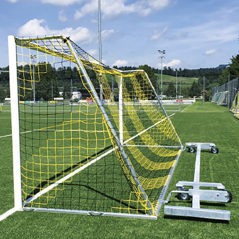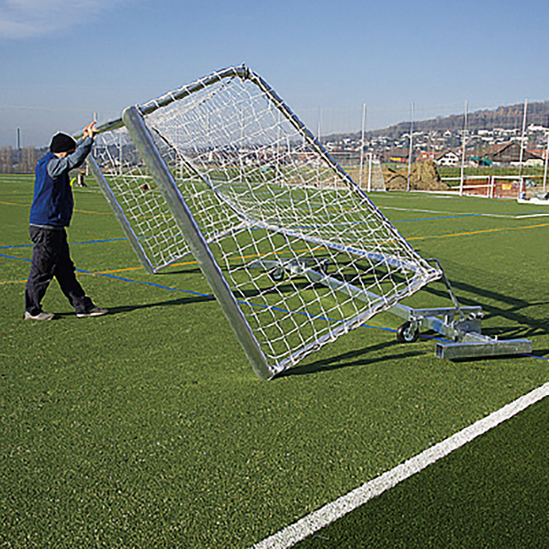 Kombi-Torwagen aus Stahl, feuerverzint für vollverschweiste Trainingstore. 4 Stück Polyamid-Lenkrollen, davon 2 Stück mit Arretierung. Das Tor kann einfach durch kippen auf den Wagen gestellt werden. Fixierung der Aufstell- und Transportposition mit einem Bolzen.