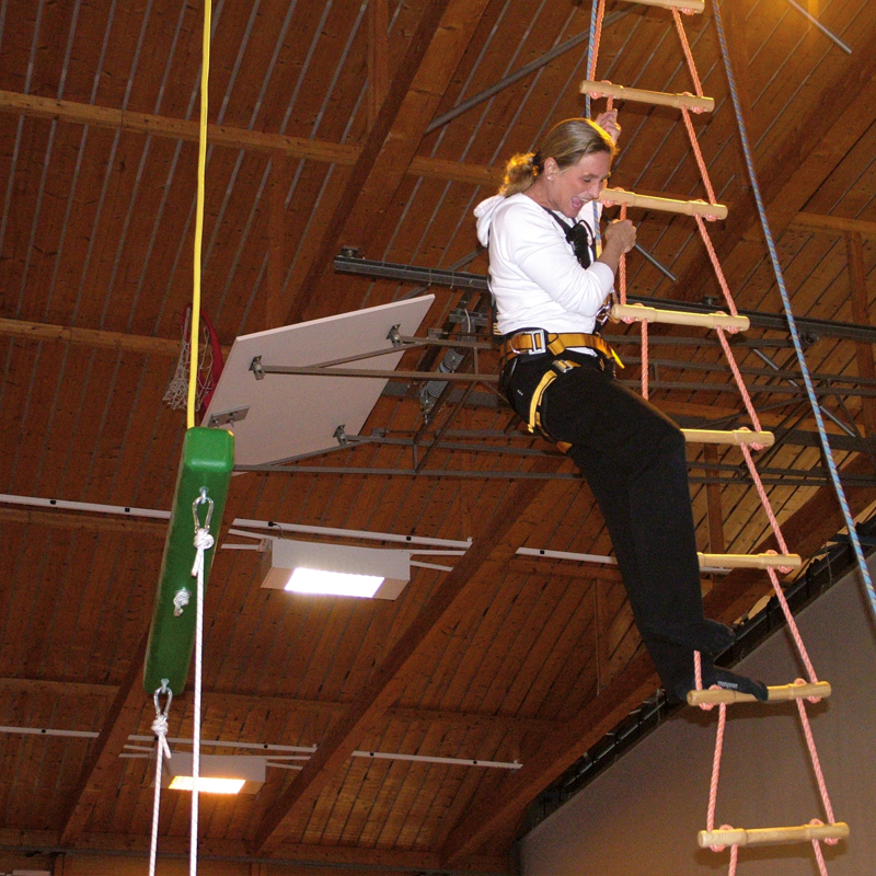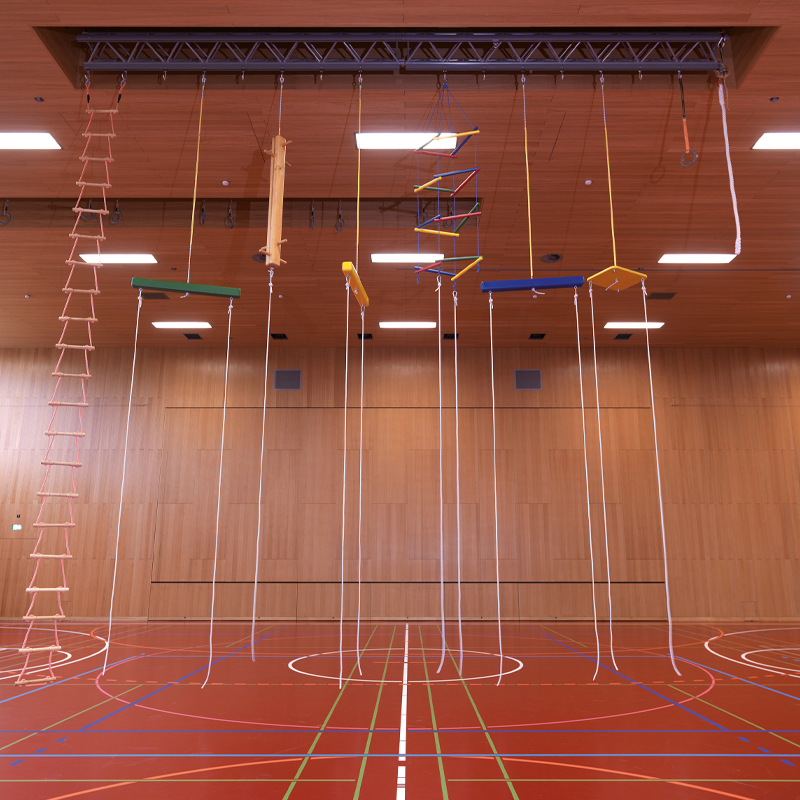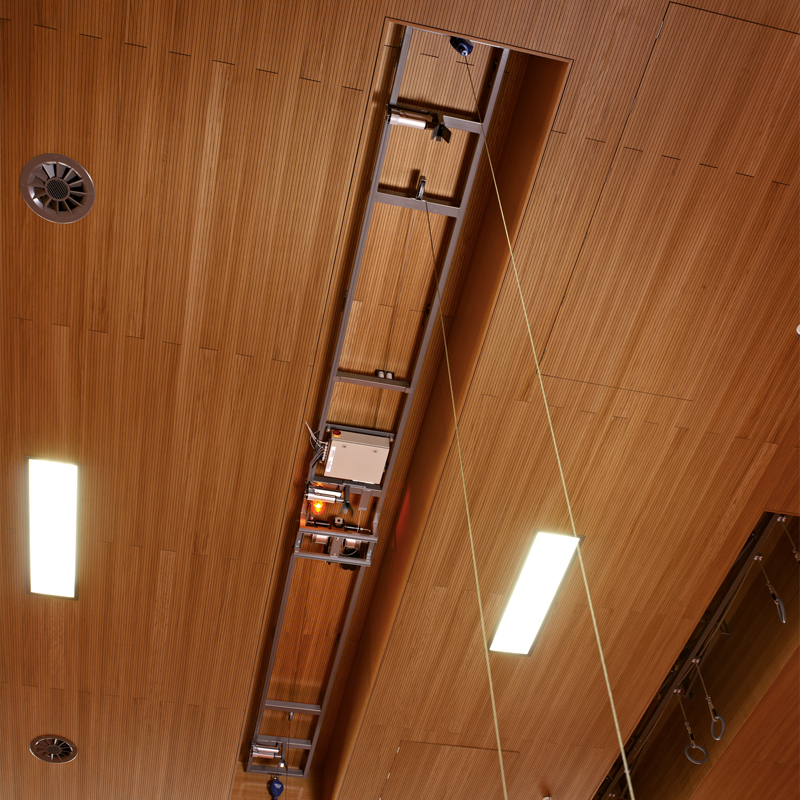 Signalanzeige und Endschalter, damit keine Geräte benutzt werden können, solange die Traverse aufgezogen oder hinuntergelassen wird.