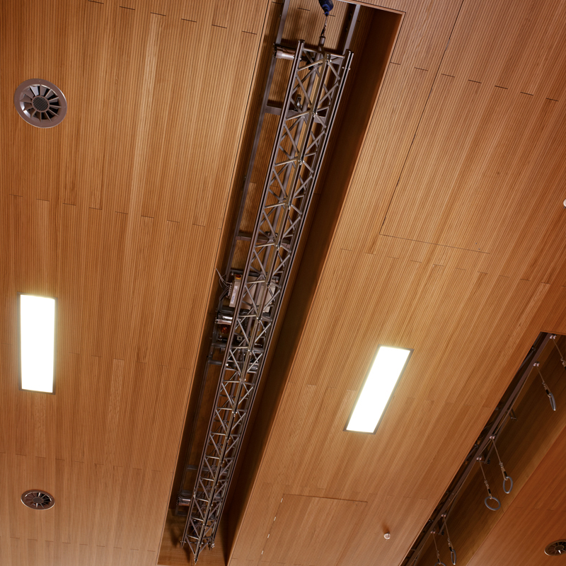 „Vario-Traverse“ aus Spezial-Aluminiumprofil mit Elektromotor 400V aufziehbar. Motor mit 2 eingebauten Endschaltern. Sicherungspaket mit