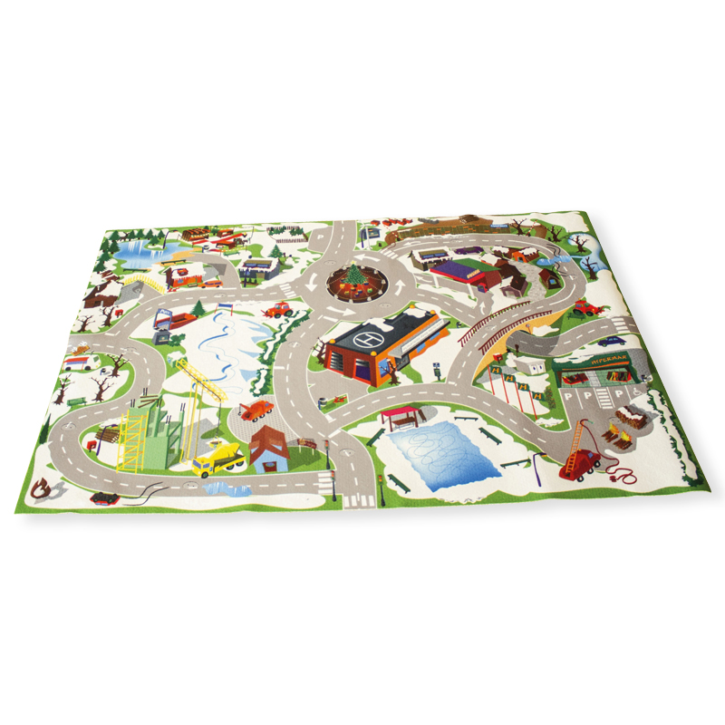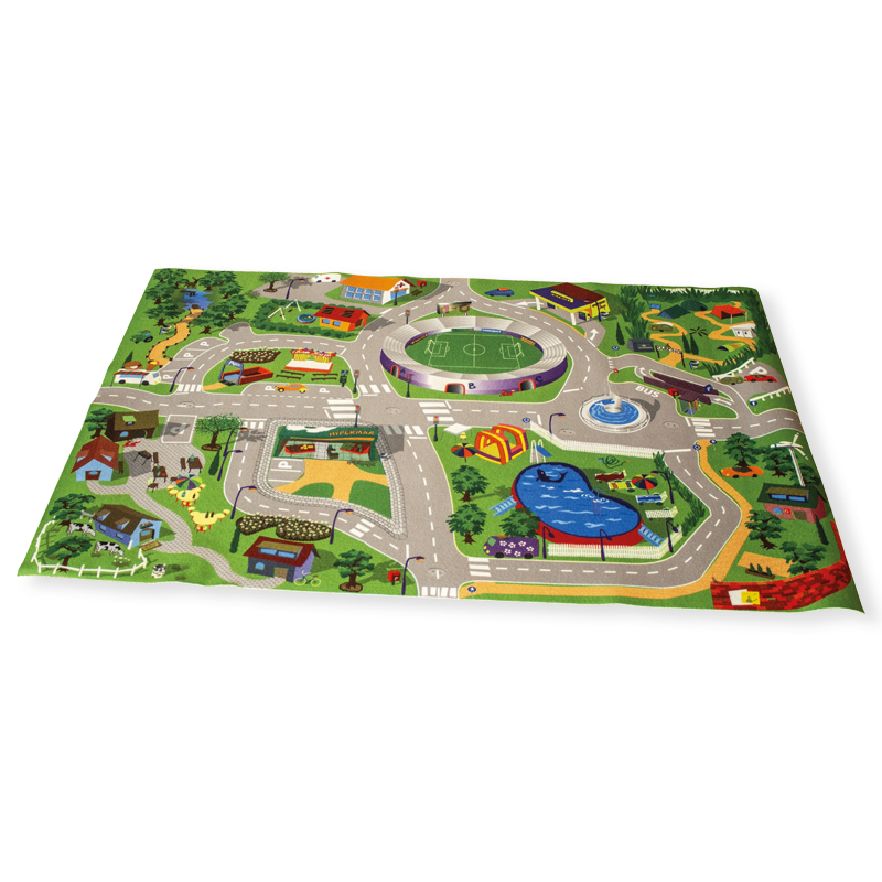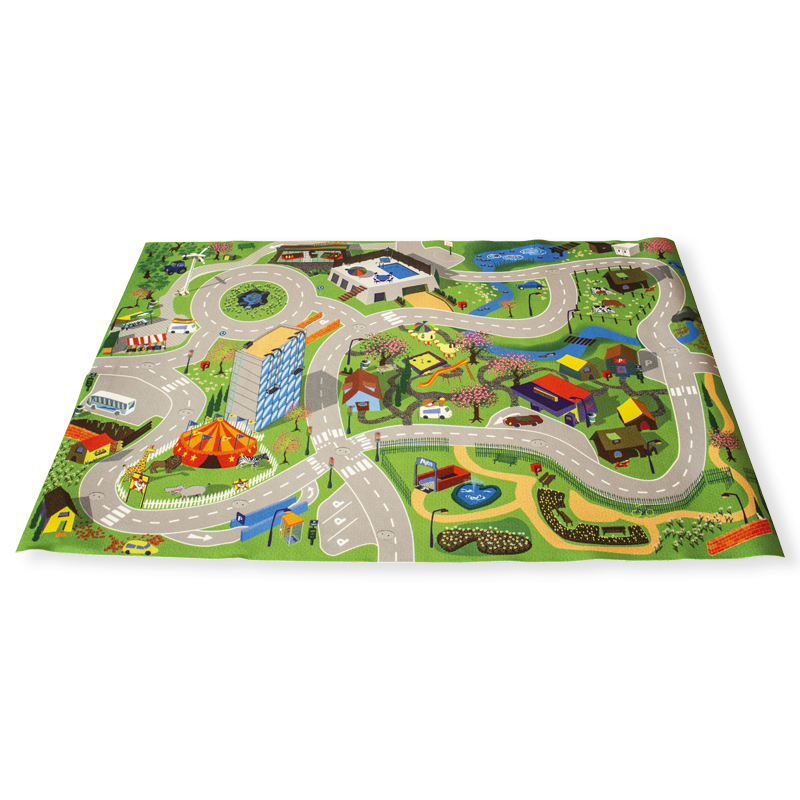 Der Spielteppich bietet zahlreiche realistische Verkehrssituationen und jede Menge Platz für Autos, kleine Verkehrszeichen und Fussgänger.