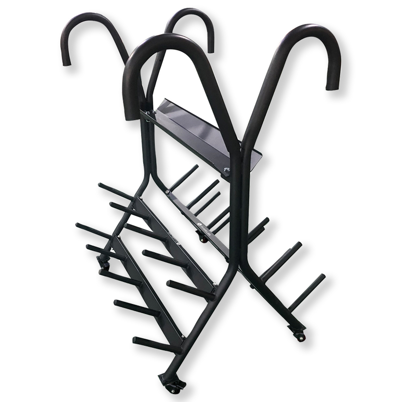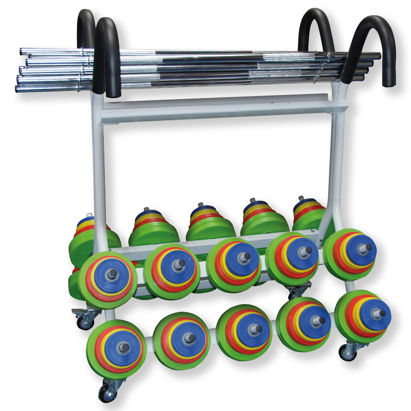 Praktischer Ablageständer auf Rollen für ca. 20 Langhantel-Sets. 20 Ablagedorne mit einer Länge von ca. 23 cm bieten Platz für bis zu 80 Hantelscheiben mit einem Durchmesser von 28 mm. Unterhalb der Hantelablage können Verschlüsse einfach in die Ablage gelegt werden.