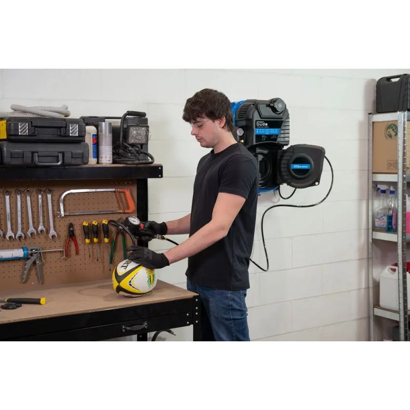 - Druckluftstation zur Wandmontage inklusive Kompressor und integrierter Automatik-Schlauchtrommel