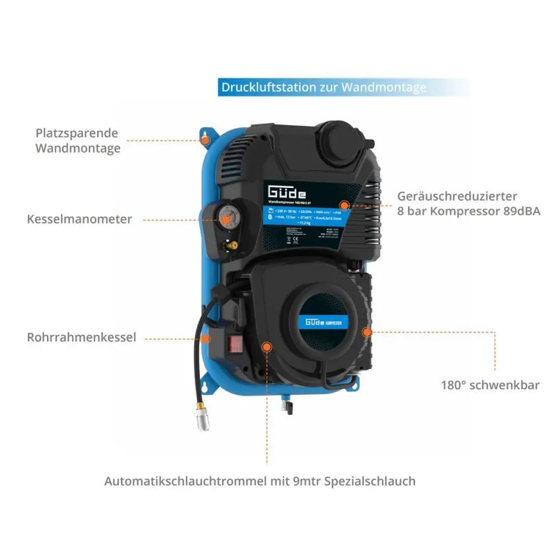 Der Güde Wandkompressor 160/8/2 ST, darf an keiner Garagen- oder Werkstattwand fehlen. Wie der Modellname schon ahnen lässt kann diese Druckluftstation platzsparend an jeder Wand montiert werden und nimmt keinen wertvollen Platz am Boden ein. Der geräuscharme Kompressor liefert einen Druck von 8 bar und die 180° schwenkbare Schlauchtrommel gewährleistet einen Arbeitsradius von 9 m. Der kompakt verbaute Verdichter ist selbstverständlich öl- und somit wartungsfrei. Der gewebeverstärkte Druckluftschlauch ist sowohl öl- als auch bis - 20° temperaturbeständig und ohne Probleme, unter Druck mit dem KFZ überfahrbar.