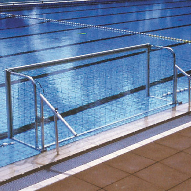 Spezial-Verankerungssystem für sämtliche Rinnenausbildungen, komplett mit Beckenrandbefestigungssatz. Aus Alu-Profil, stabile Konstruktion, unsinkbar durch ausgeschäumte Schwimmer, einfache und schnelle Austarierung. Nach intern. Vorschrift (lichtes Mass 300 x 90 cm). 2-Punkt-Leinenbefestigung, freihängendes Netz (keine Bügel in der Tormitte!). Nirosta-Netzhaken, Einbrennlackierung weiss. Schneller Auf- und Abbau, raumsparende Aufbewahrung. Lieferung paarweise.