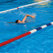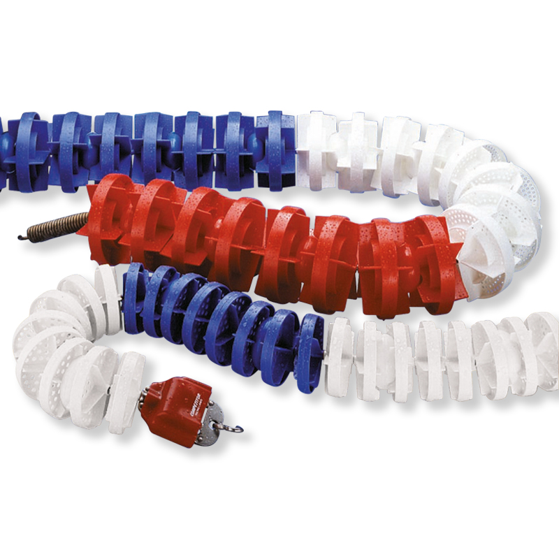 Wellenbrechende Schwimmleine mit freirotierenden Speziallochscheiben (Ø 10 cm) für eine schnelle Wasserberuhigung. Die Schwimmleinen aus Stahlseil haben sich vielfach in Wettkampf und Training bewährt. Die freirotierenden Disken, sogenannte Micro Donuts, bieten optimale Bedingungen auf allen Bahnen. Gemäss FINA-Vorschrift.