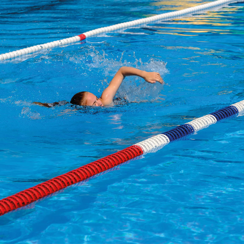 Wellenbrechende Schwimmleine mit freirotierenden Speziallochscheiben (Ø 10 cm) für eine schnelle Wasserberuhigung. Die Schwimmleinen aus Stahlseil haben sich vielfach in Wettkampf und Training bewährt. Die freirotierenden Disken, sogenannte Micro Donuts, bieten optimale Bedingungen auf allen Bahnen. Gemäss FINA-Vorschrift.