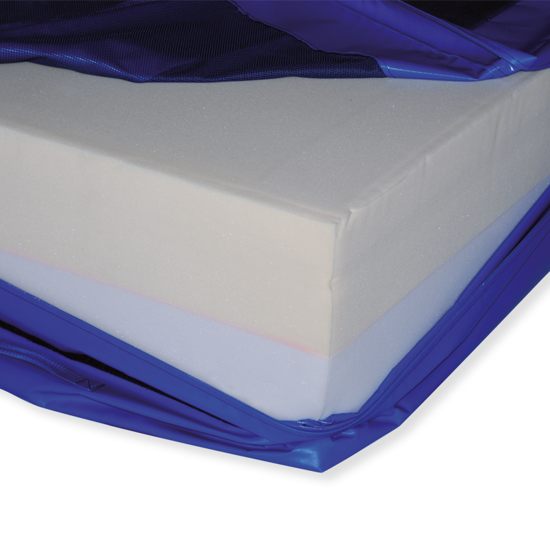 Oberteil aus luftdurchlässigem Gittergewebe, unten mit Gleitschutz, 8 Tragegriffe, längs und quer mit angenähtem Verbindungslappen. 2-lagiger-Schaumstoffkern mit unterschiedlichen Stauchhärten.