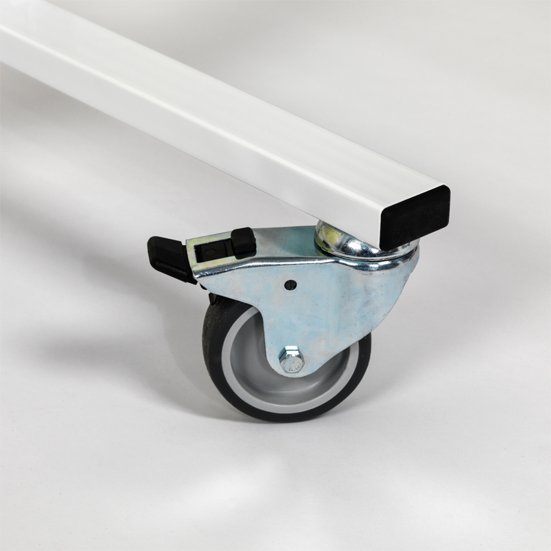 - Das robuste weisse Gestell hat eine lange Ablageleiste und vier solide industrielle Rollen, davon zwei mit Bremsen
