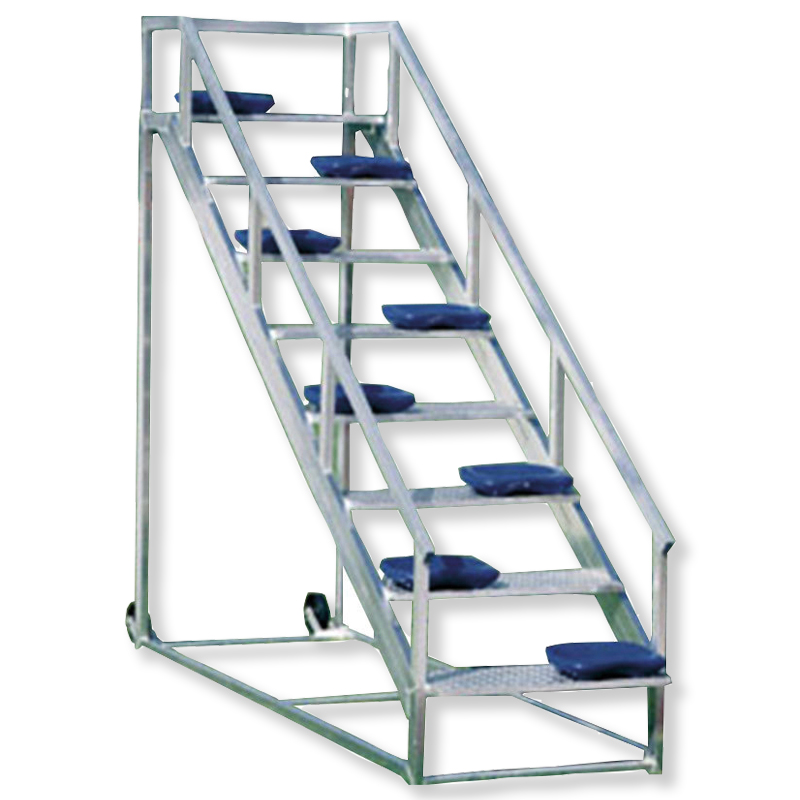 Es ist eine verschiebbare Ziel- und Zeitnehmertreppe mit versetzten Sitzplätzen für ein besseres Sichtfeld der Wettkampfrichter bei der Zeitmessung. Durch die gestaffelte Sitzweise bietet die Treppe eine gute Übersicht bei der manuellen Messung per Stoppuhr. Der Transport gestaltet sich durch die extra breiten Räder und den enthaltenen Heberoller sehr einfach.